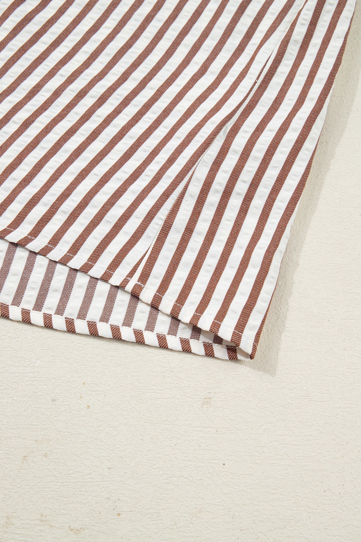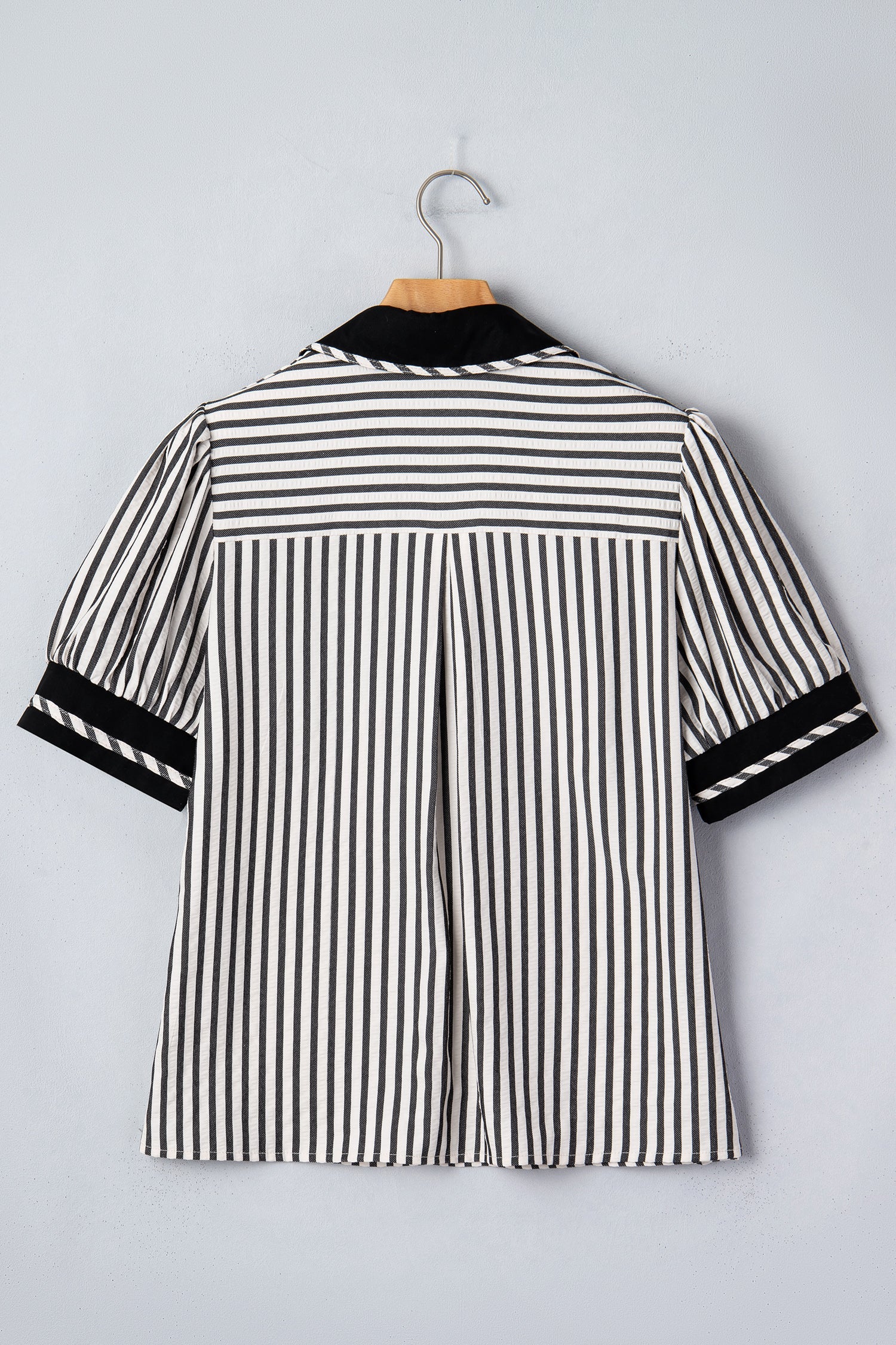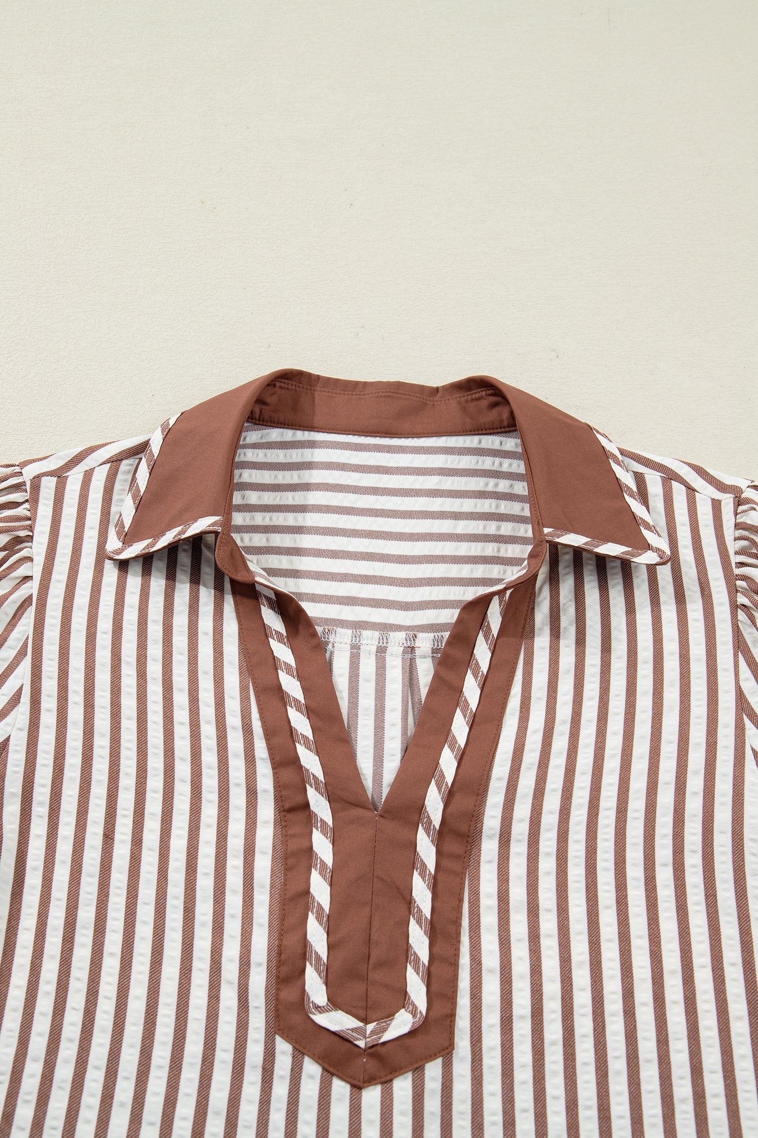 Stripe Collared V-Neck Bubble Sleeve Blouse